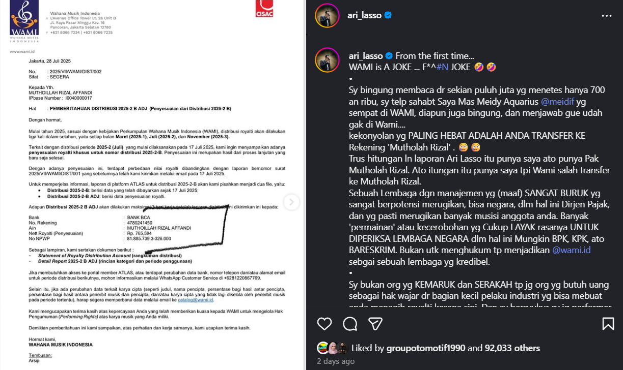 “Banyak ‘permainan’ atau kecerobohan (WAMI) yang cukup layak rasanya untuk diperiksa lembaga negara, dalam hal ini mungkin BPK, KPK, atau Bareskrim. Bukan untuk menghukum tapi menjadikan @wami.id sebagai sebuah lembaga yang kredibel,” tulis Ari Lasso dalam keterangan unggahan Instagram pribadinya @ari_lasso, pada Senin, 11 Agustus 2025.