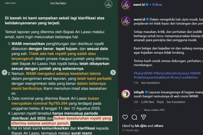 “Tidak ada hak royalti yang salah atau terpengaruh dalam proses maupun jumlah yang diterima oleh Bapak Ari Lasso. Hak royalti beliau telah dibayarkan sesuai dengan jumlah yang sebenarnya,” tulis WAMI dalam keterangannya, Selasa, 13 Agustus 2025.