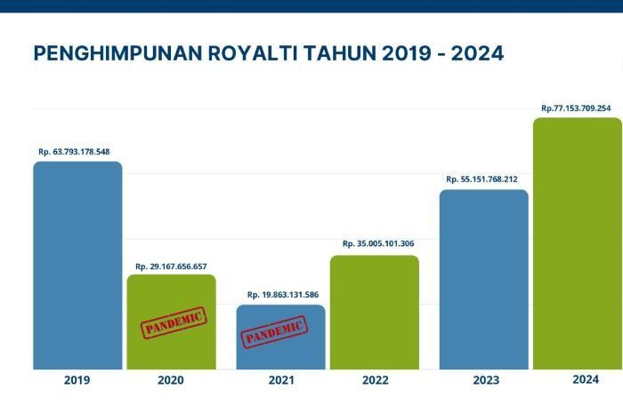 Berdasarkan data LMKN, penghimpunan royalti tahun 2024 mencapai Rp77,153 miliar, meningkat drastis dari Rp19,863 miliar pada tahun 2021.