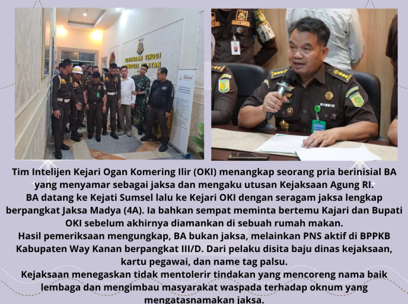 KAYU AGUNG , BERJAYANEWS.COM,– Aksi nekat seorang pria berinisial BA yang menyamar sebagai jaksa akhirnya terbongkar. Tim Intelijen Kejaksaan Negeri (Kejari) Ogan Komering Ilir (OKI) berhasil mengamankan pelaku di sebuah rumah makan di Kayu Agung pada Senin (6/10/2025) siang.