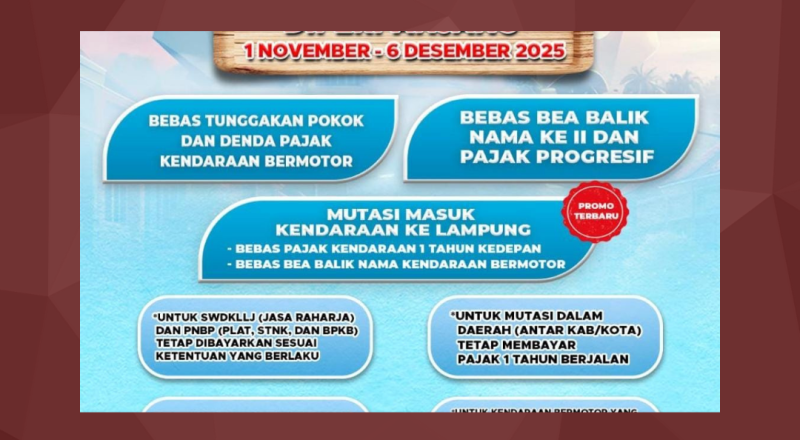 BERJAYANEWS.COM,- Pemerintah Provinsi Lampung kembali memperpanjang program pemutihan pajak kendaraan bermotor (PKB) hingga 6 Desember 2025.