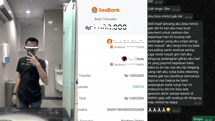 Nanda mengaku saat itu ia diminta mentransfer uang ke rekening Sea Bank tante pelaku dengan inisial YE sebesar Rp 1 juta. Namun, hingga Rabu 3 Desember 2025, janji tersebut tidak pernah dipenuhi.