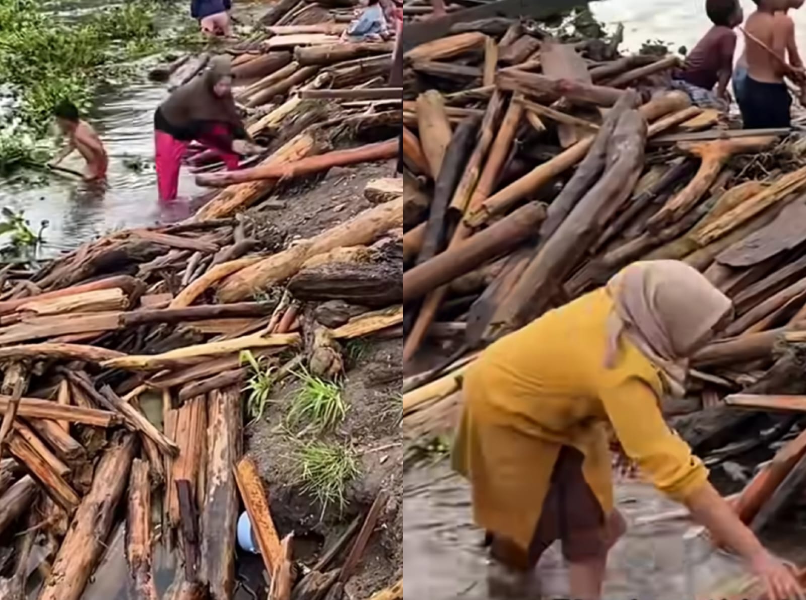 Video menunjukkan beberapa warga turun ke sungai dan mulai menepikan potongan-potongan kayu.